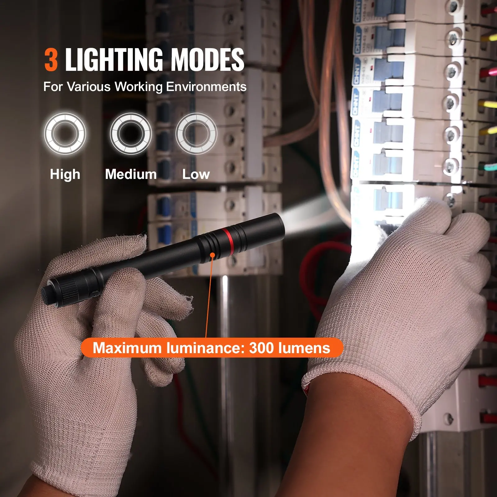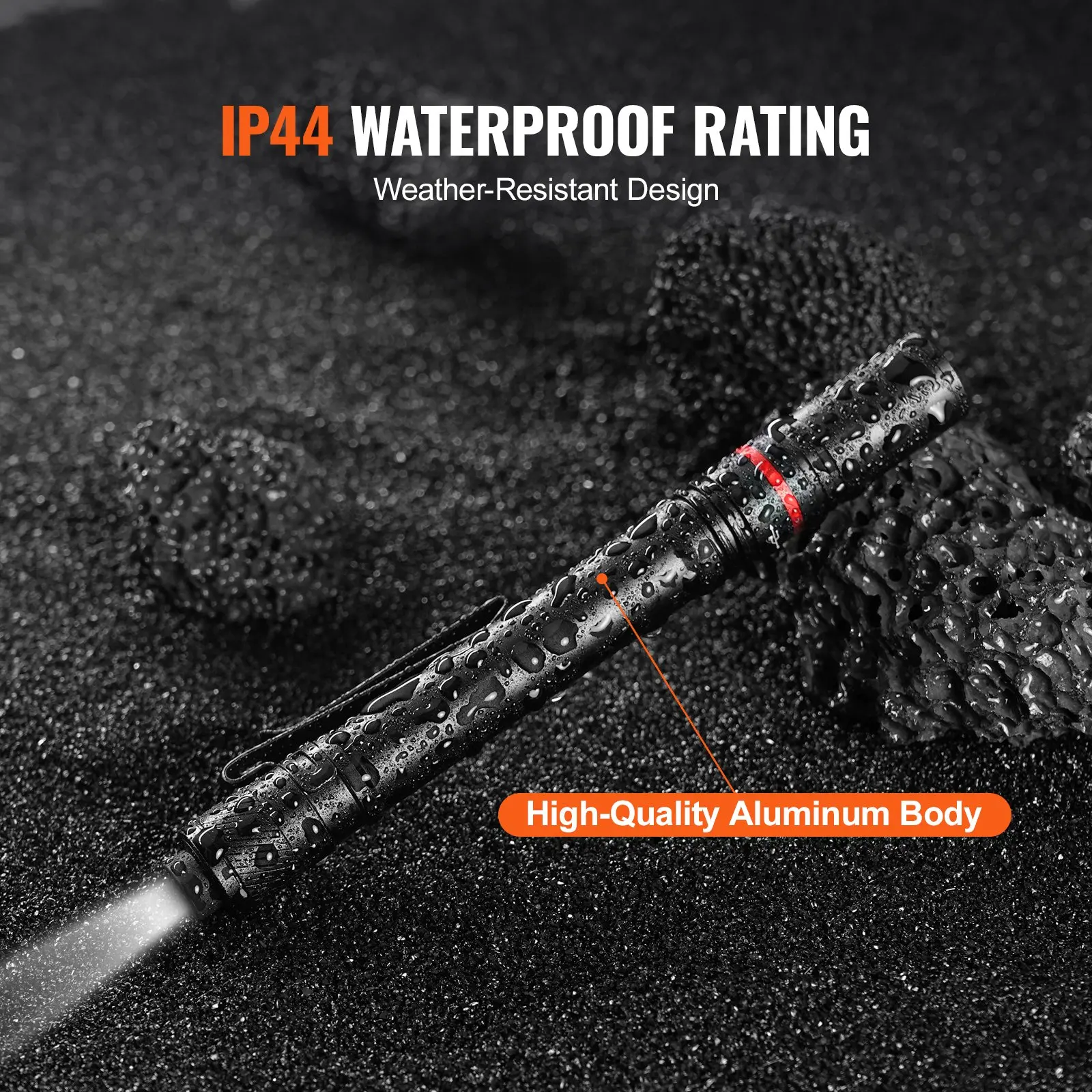 Light Modes: High/Medium/Low,Lumens: 300,Battery Capacity: 750mAh,Waterproof Rating: IP44,Color: Black,Product Weight: 0.21 lbs/0.095 kg,Light Source: White LED,Product Dimensions: 5.9 x 1.46 x 0.59 inches/149.86 x 37.08 x 14.99 mm,Battery Type: Rechargeable lithium battery or 2*AAA batteries,Main Material: Aluminum alloy,Charging Port: Type-C