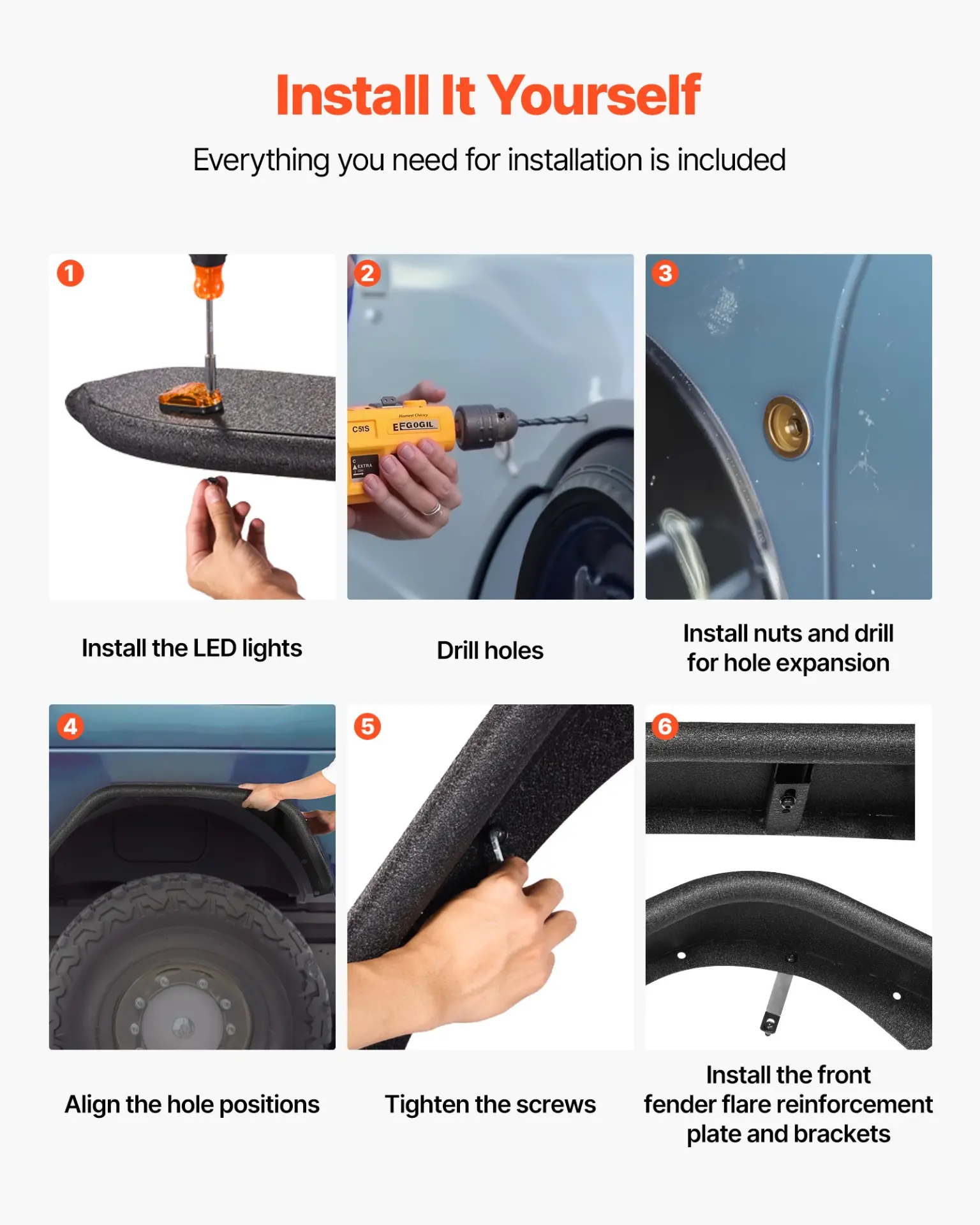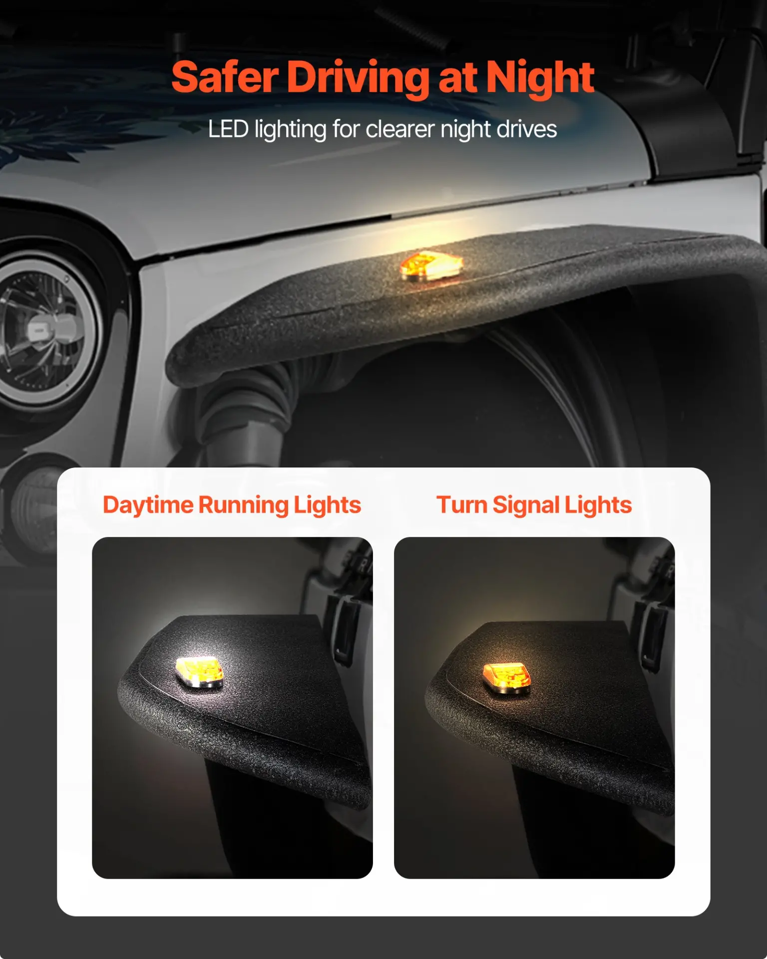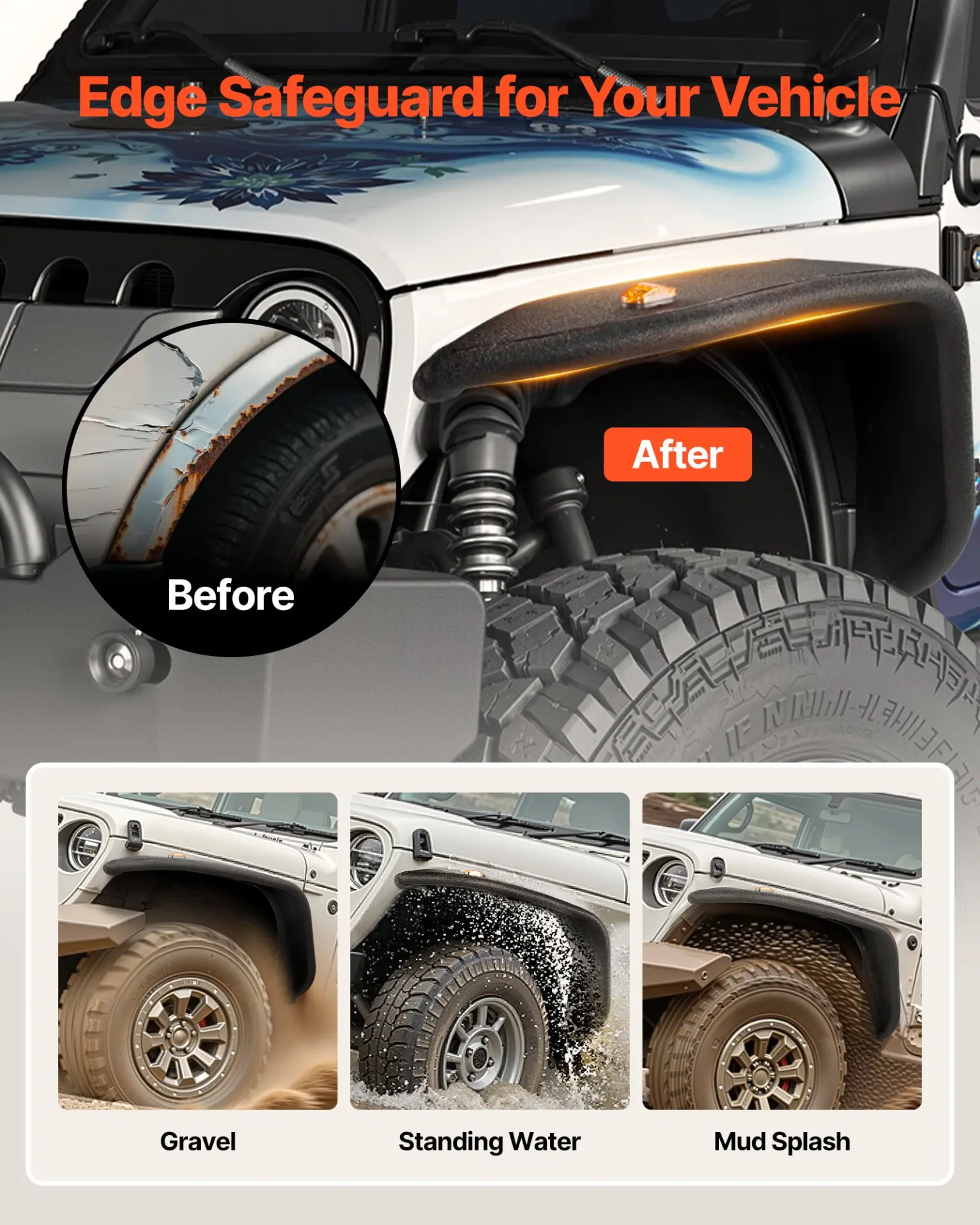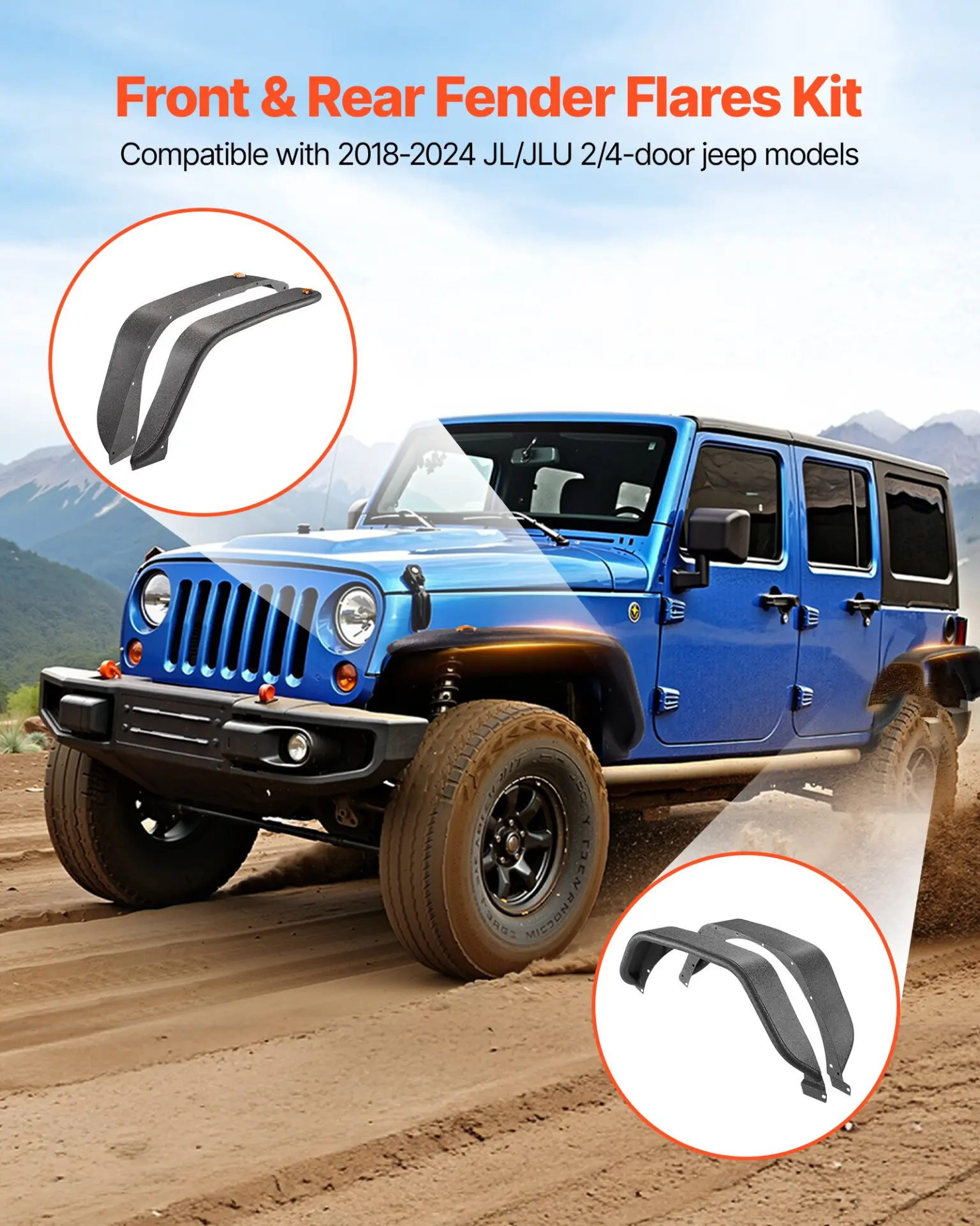 VEVOR Fender Flare, Front & Rear Jeep Fender Flares Compatible with 2018-2024 Jeeps JL/JLU 2/4 Doors, Off-Road Steel Liner Set with LED Lighting, Fine-Textured Black Paintable Fenders for Jeep JL