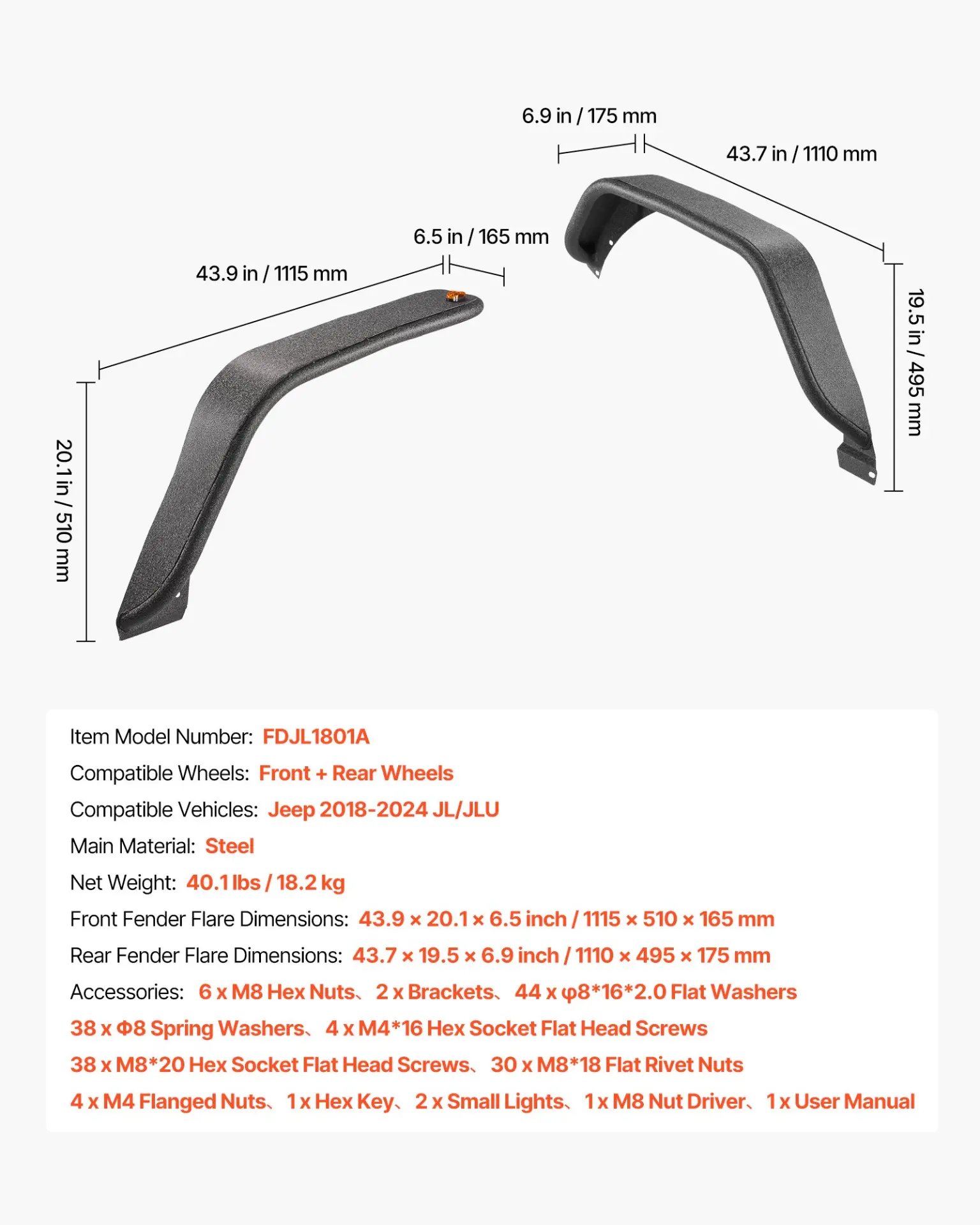Rear Fender Flare Dimensions: 43.7 x 19.5 x 6.9 inch / 1110 x 495 x 175 mm,Compatible Wheels: Front + Rear Wheels,Item Model Number: FDJL1801A,Compatible Vehicles: Jeep 2018-2024 JL/JLU,Front Fender Flare Dimensions: 43.9 x 20.1 x 6.5 inch / 1115 x 510 x 165 mm,Net Weight: 40.1 lbs / 18.2 kg,Main Material: Steel