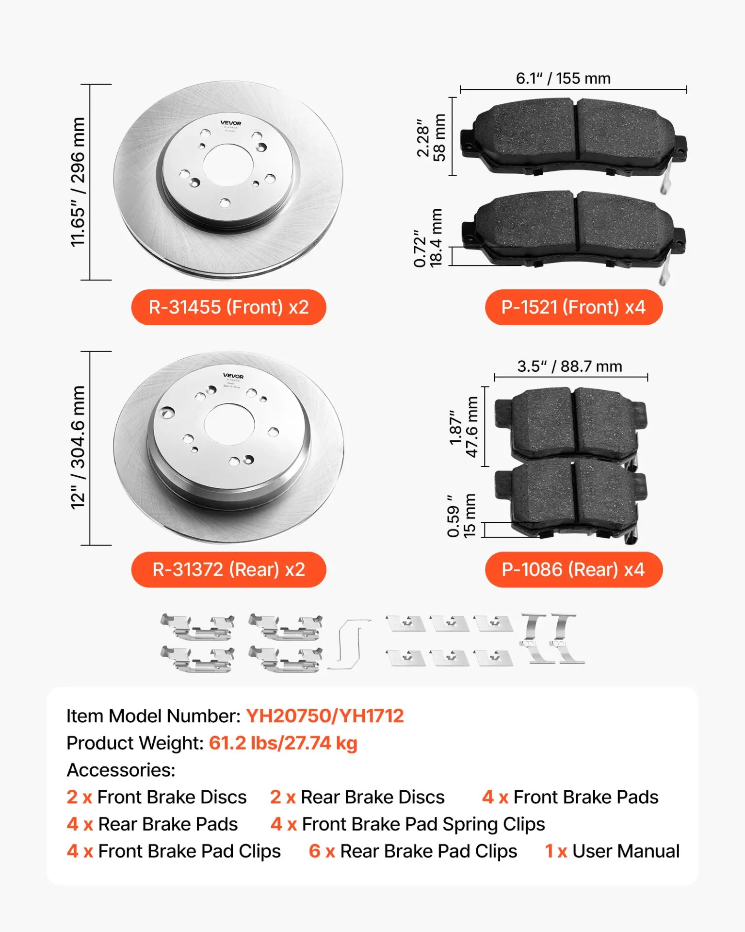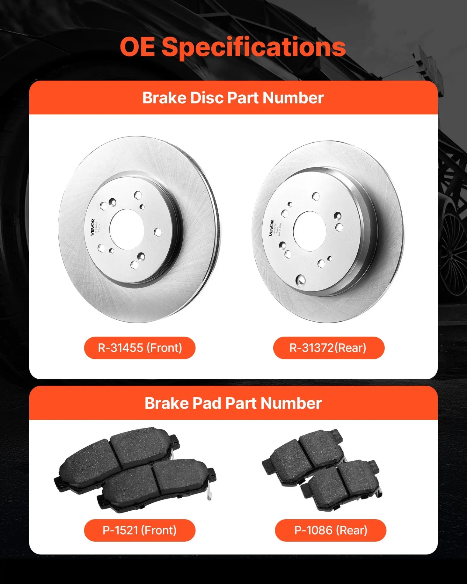 VEVOR Front & Rear Brake Kit Compatible with 2012-2016 Honda CR-V (AWD Models), Ceramic Brake Replacement Kits, 12 inch Hollow Structure Front Rotors, 12 inch Solid Structure Rear Rotors, R-31455